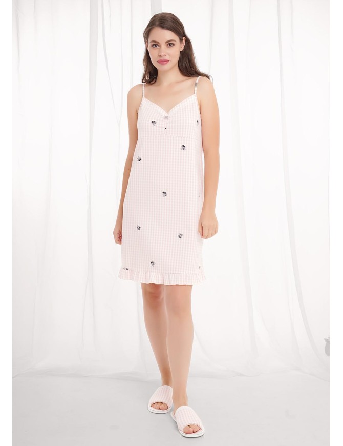 Ночная сорочка из хлопкового трикотажного полотна с добавлением эластана. А-силуэта на узких бретелях. По горловине переда обтачка с кружевом, бант. Отрезной лиф со сборкой. По пройме окантовка. По низу изделия рюша.