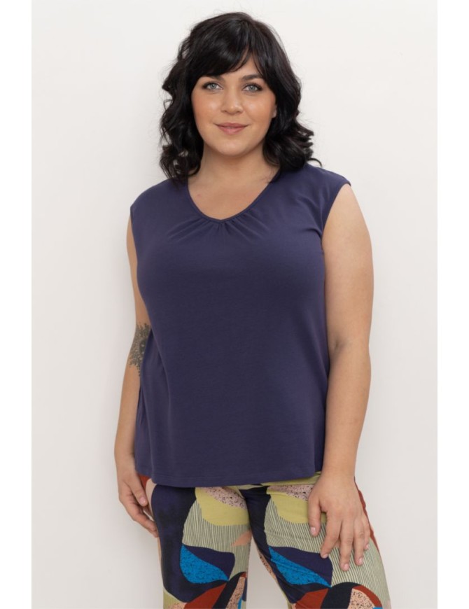Топ женский свободного прилегания с круглым вырезом горловины, без рукавов. Горловина декорирована сборкой.