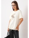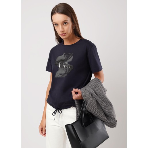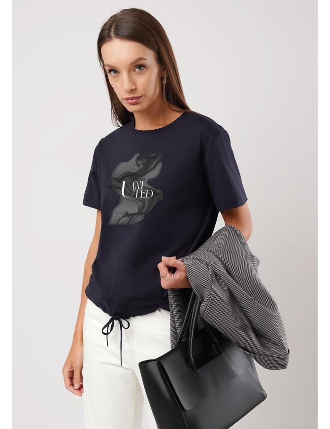Джемпер из поливискозного трикотажного полотна джерси. Округлая горловина с обтачкой, короткий втачной рукав. По низу кулиса. По переду принт.