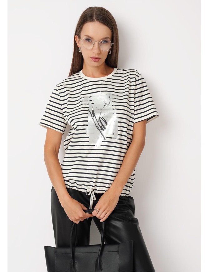 Джемпер из хлопкового трикотажного полотна. Округлая горловина с обтачкой из рибаны, короткий втачной рукав. По низу кулиса. По переду принт фольга.