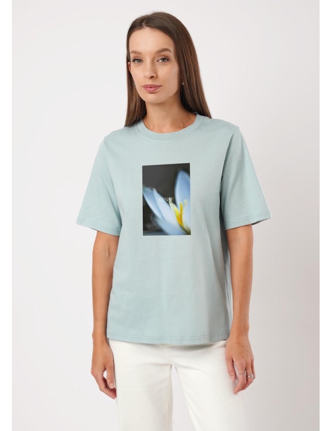Футболка удлиненная из хлопкового трикотажного полотна. Округлая горловина с обтачкой из рибаны, короткий втачной рукав. По бокам разрезы. Спереди фото принт.
