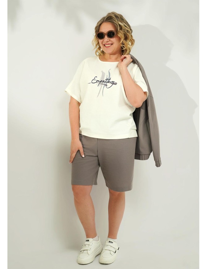 Джемпер свободного кроя из трикотажного полотна пике. Округлая горловина с внутренней окантовокй. Короткий цельнокроенный рукав. Сзади средний шов. По низу спинки изделия притачной манжет. Спереди принт.