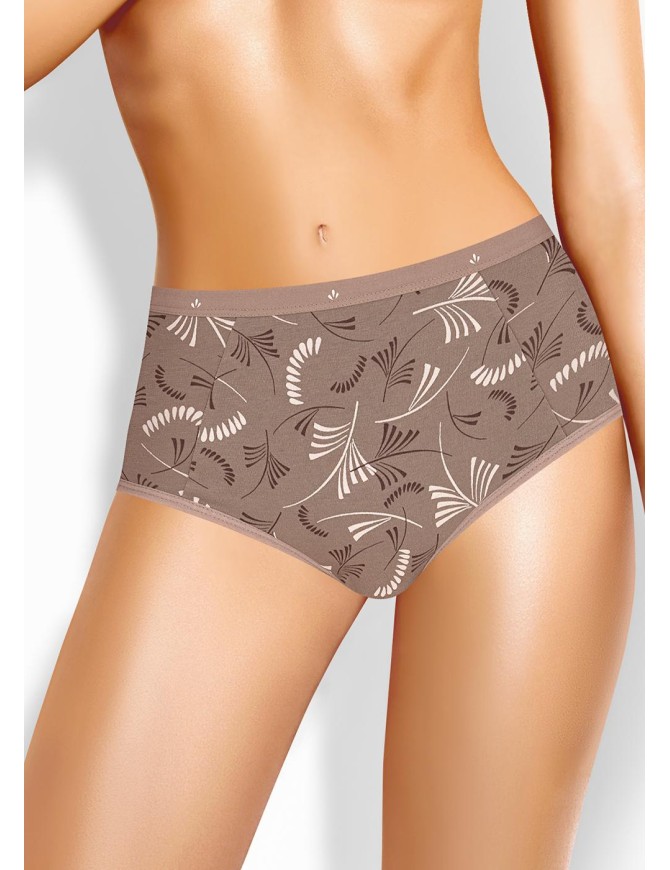 Трусы макси женские из эластичного хлопкового полотна. Обработка краев по талии резинка с принтом, по ноге - полуокантовка. По переду резы с двойной центральной частью.