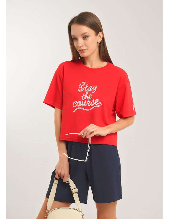 Футболка прямого силуэта из трикотажного полотна пике. Округлая горловина с обтачкой из рибаны. Короткий рукав со спущенной линией плеча. На детали переда принт.