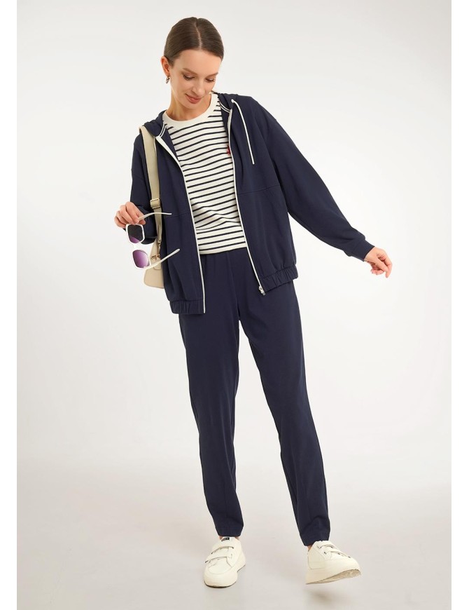 Куртка- бомбер из трикотажного полотна пике с застежкой на молнию, умеренного объема, с капюшоном. Длинный рукав со спущенной линиией плеча. По переду рельефы, карманы в швах. По низу рукава и изделия манжет со вставкой из резинки.