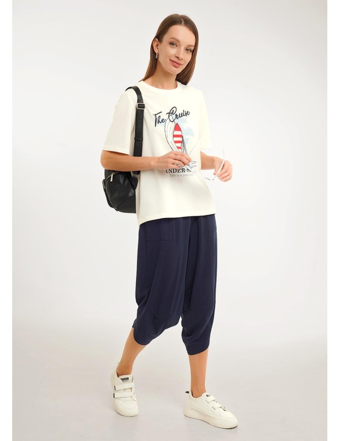 Футболка прямого кроя из из трикотажного полотна пике. Короткий втачной рукав. Округлая горловина с обтачкой. Спереди принт, боковые разрезы.