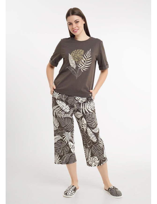Набор одежды для дома и отдыха из трикотажного полотна.Футболка прямого кроя, горловина с обтачкой. Короткий втачной рукав,внизу вышивка.Спереди принт со вспенкой. Бриджи на резинке. Боковые карманы с отрезным бочком.