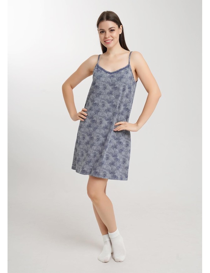 Ночная сорочка А-образного силуэта из хлопкового трикотажного полотна. Длиной чуть ниже колена, на узких бретелях. По горловине и пройме окантовка. Вырез горловины декорирован кружевом..